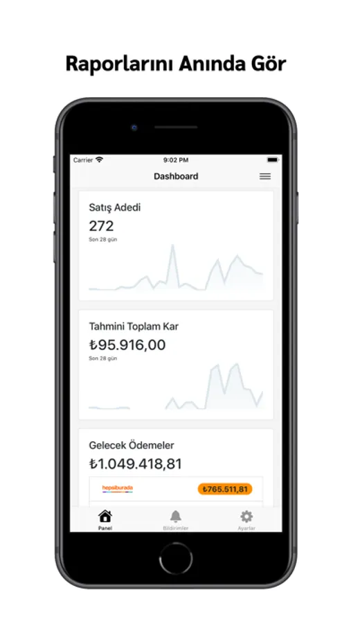 Satış Kanallarında bulunan ürünleri görün, satışları yönetin, fatura kesin ve ayarlarınızı yönetin. Ayrıntılı dashboard ve rapor sistemi sayesinde satışlarınızı görün ve artırın. Bildirimler sayesinde yeni satış geldiğinde, buybox sıranız değiştiğinde size anında bildirim gelsin.