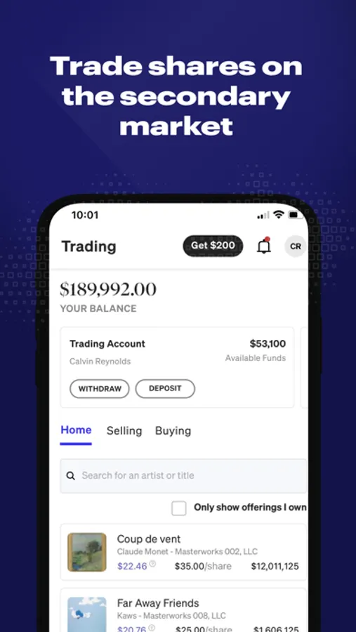 At Masterworks, we understand that investing in art can be intimidating, which is why we provide educational resources and insights about the art market to help you make informed investment decisions. You'll also have access to our trading platform, which allows you to buy and sell shares in artworks like stocks, giving you even more flexibility and control over your portfolio.