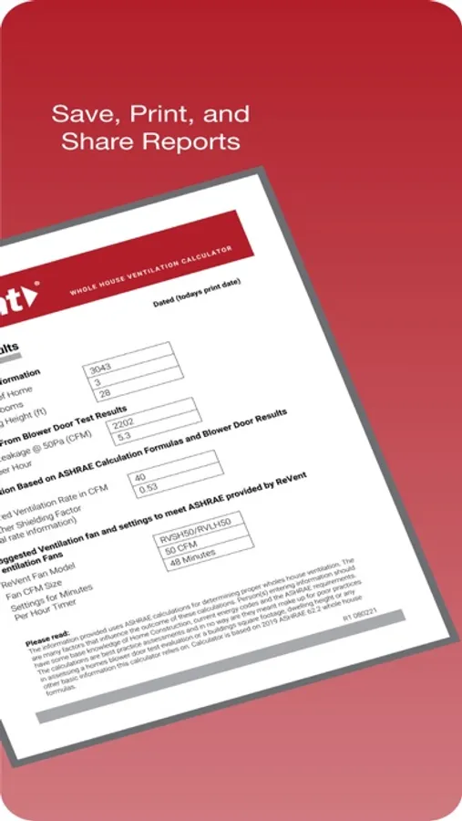 Print and share the numbers calculated directly from the app. ReVent’s fans and controls offer the perfect solution to meet the Required Ventilation Rate. Install the recommended ReVent Model in the home. Set the ReVent control to the Minutes Per Hour recommendation and you’re done. This is an easy and inexpensive solution to bring any home up to modern ventilation requirements for indoor air quality.
