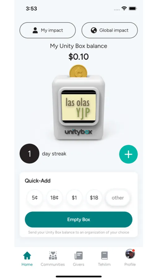 Our digital charity box app connects you with a global community of conscious givers who give spare change digitally with just one tap throughout their day. Watch your tiny bits of generosity add up and send it to the charity of your choice to make an impact.