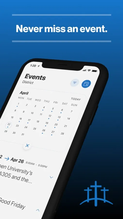The event section shows a list of events throughout the district. Users can add an event to their calendar to share the event with friends and family with one tap.