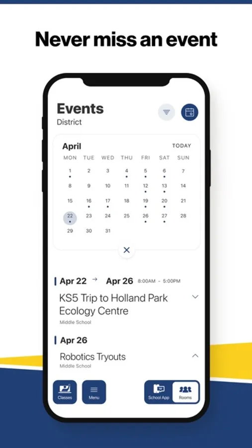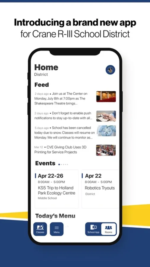 The event section shows a list of events throughout the district. Users can add an event to their calendar to share the event with friends and family with one tap.