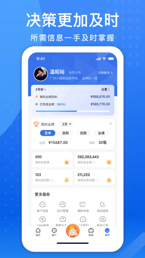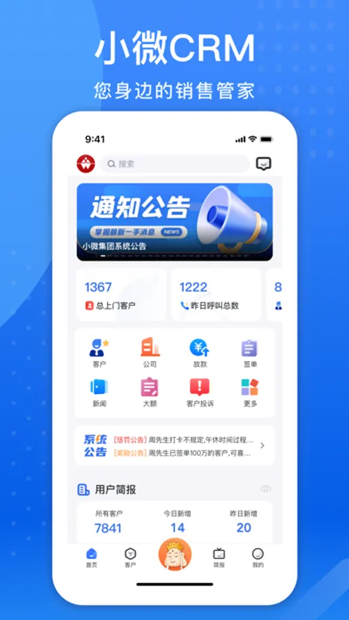 小微集团CRM是一款自主研发的移动客户关系管理应用,以销售业务场景为核心,签单全流程与客户全生命周期自动化、数据化管理,以驱动业绩为目标,链接企业内部架构协同作战,助力企业组织内部高效协助网络,实现以客户为中心的全员高效营销协助和业绩增长;