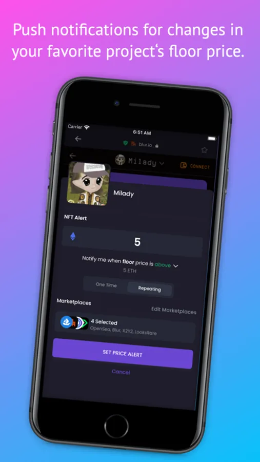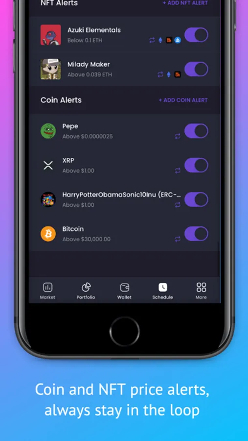 - Set alerts and get notified of price changes on NFTs and coins.