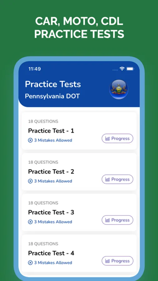 Are you applying for the Pennsylvania DOT DMV permit driver’s license test certification? Use this application to study for, improve your score on, and ultimately pass both the CDL driver's licence test and the DMV driver's licence test for the state of Pennsylvania DOT in order to obtain your permit on the very first attempt.