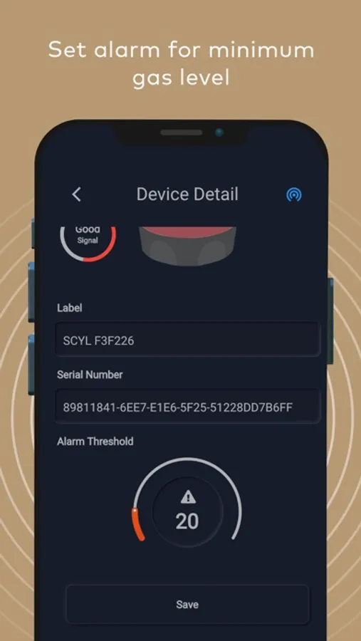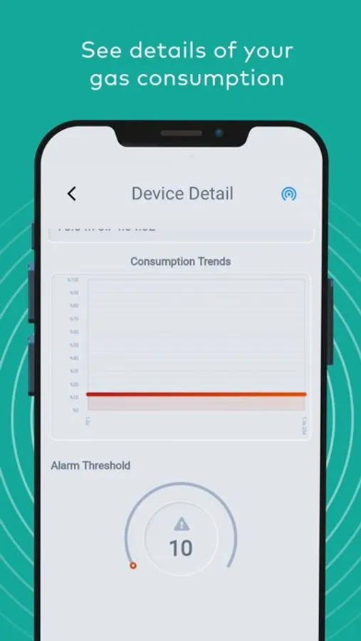 Now, you can check your current gas level in app. EvaSmart also periodically measures the gas level and sends all stored results to the app. With this stored data, the app generates a graph showing the consumption history and estimate the remaining time to run out of gas. You can also set an alarm threshold to be alerted when the gas level drops below the critical level.