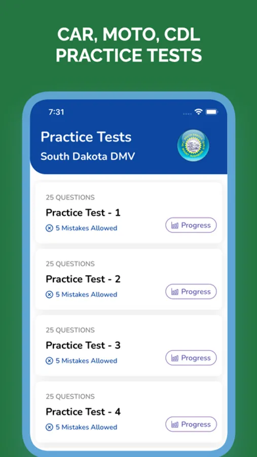 This app includes questions based on official South Dakota DMV state manual. The app allows you to prepare and practice for the Car, Motorcycle and Commercial Driving license (CDL) driver’s license test for South Dakota State and all practice tests are based on the latest manuals. So if you are searching for DMV driver’s license test 2023 preparation – this is the perfect DMV driver’s license test practice app for you. This app is a driver's license handbook manual to practice and prepare for DMV Knowledge Test Permit.