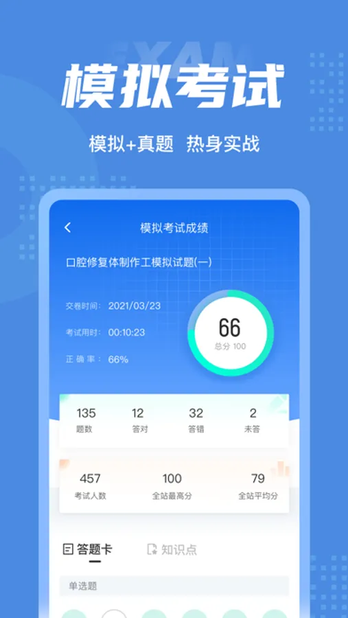 口腔修复体制作工题库内含考点练习,全国通用卷以及地区卷模拟练习,以及按照固定考试比重的随机式的抽题的真题考场,成绩单实时记录考试数据,一点一