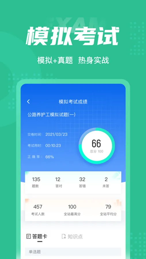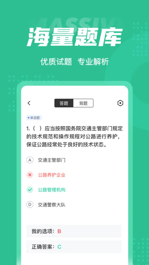公路养护工题库内含考点练习,全国通用卷以及地区卷模拟练习,以及按照固定考试比重的随机式的抽题的真题考场,成绩单实时记录考试数据,一点一滴的反馈考生近期学习状态以及自我正确率的提升,大大的给予考生通过考试的信心。