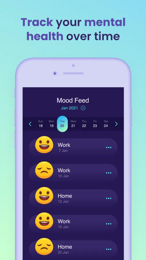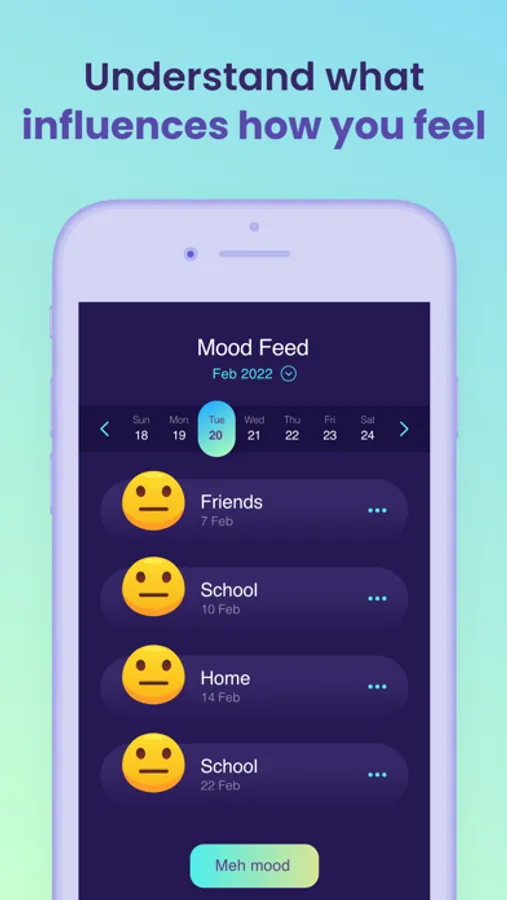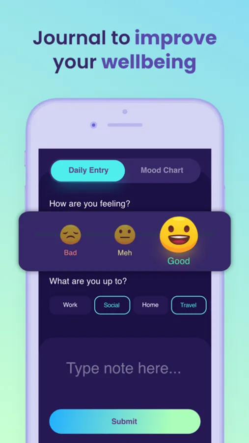 Practice regular daily self-reflection in your mood diary. Sort your moods into Good, Meh and Bad, and tag activities, like work, study and school. Add your innermost thoughts and emotions to the notes section of your diary - you can choose to share your mood, but your notes will only ever be visible to you.