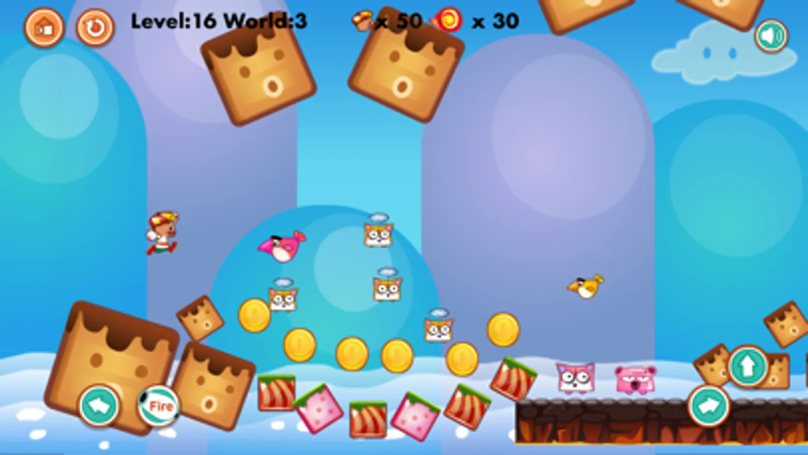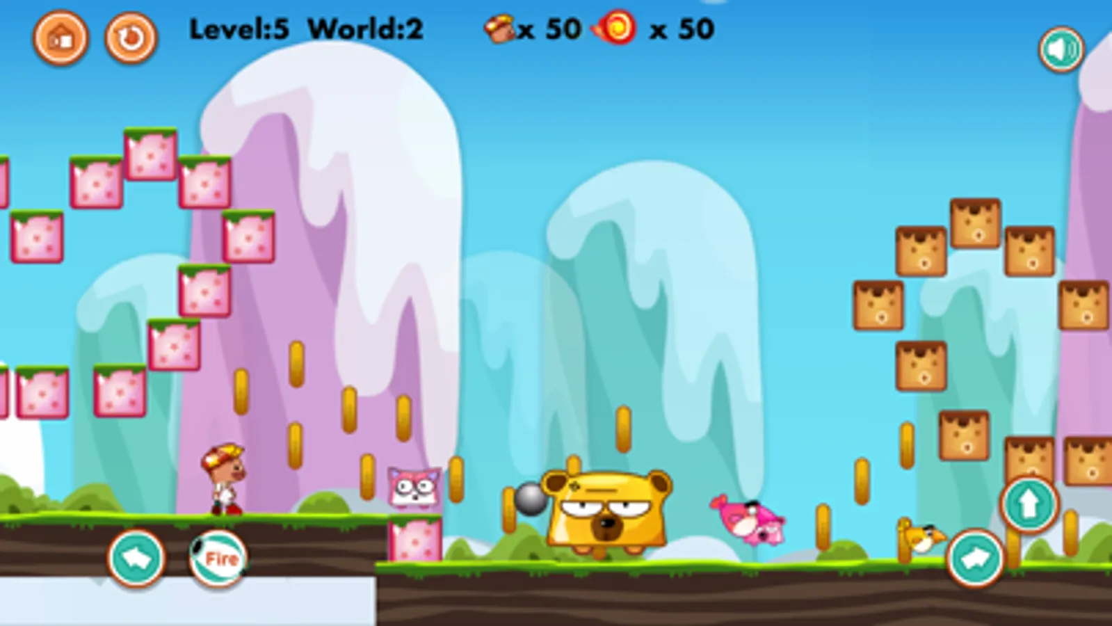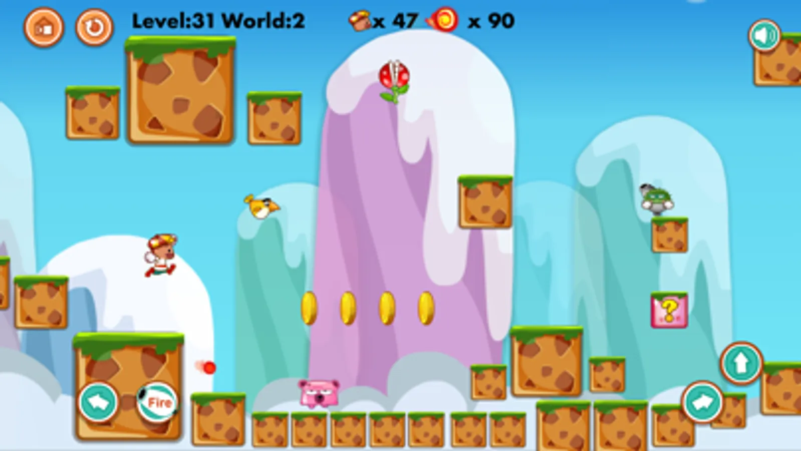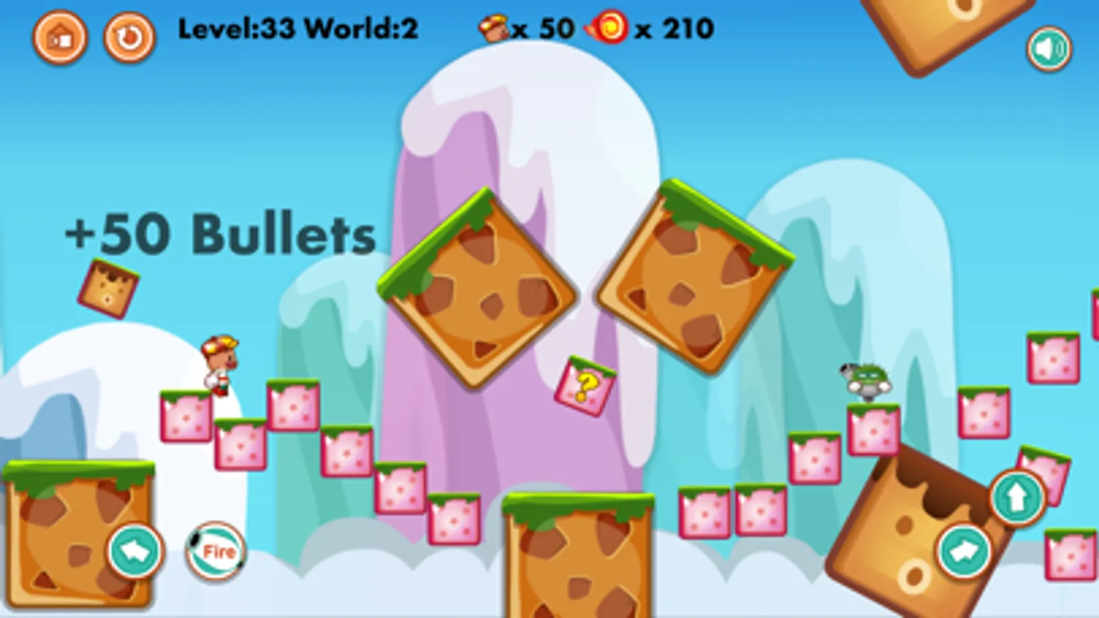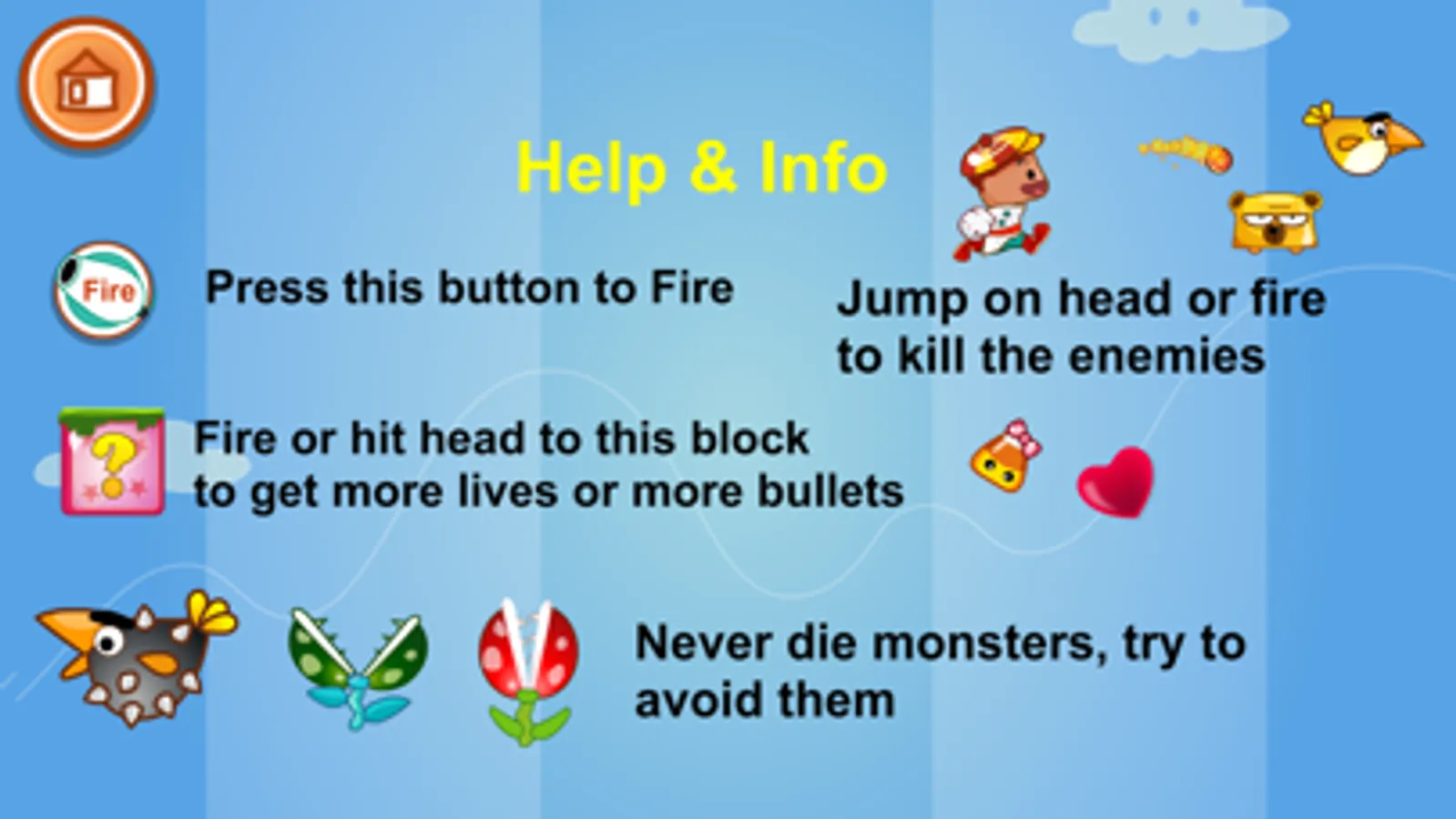 Join in the adventure with the small hero to discover amazing worlds with plentiful of obstacles but fun. You have to pass through a jungle of enemies to go home. On the way, you have to fire them with the bullet you got in each level, or jump over the enemies head to destroy them. Some of the enemies can not be kill, just try to avoid them. Be aware of the creatures which can fire you back also, with fire ball bullet or cannon bullet that can go through even brick or wall.