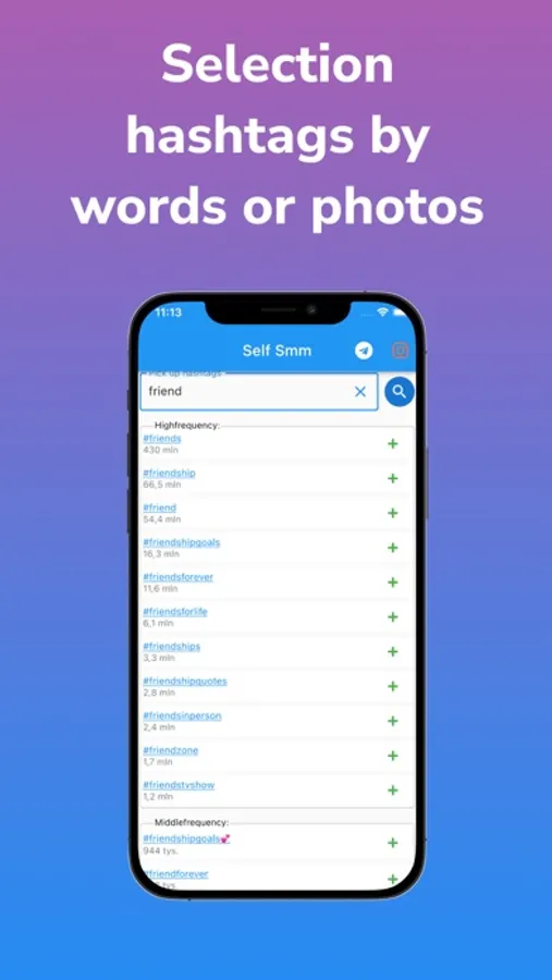 Hashtag selection - the application selects similar hashtags with a breakdown by frequency and with download in excel.