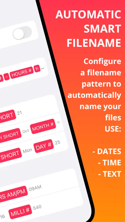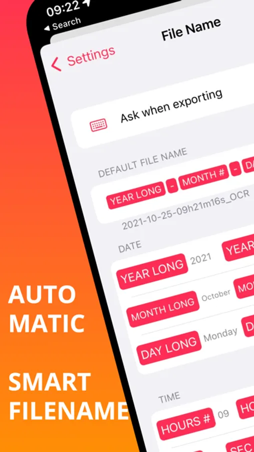 • Automatic file naming: configure a pattern with dates/time/text to generate the filename automatically on document creation