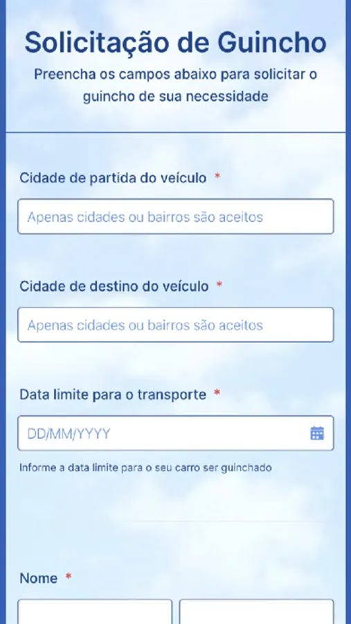 Para o serviço de guincho informe o local de remoção e também de entrega do automóvel