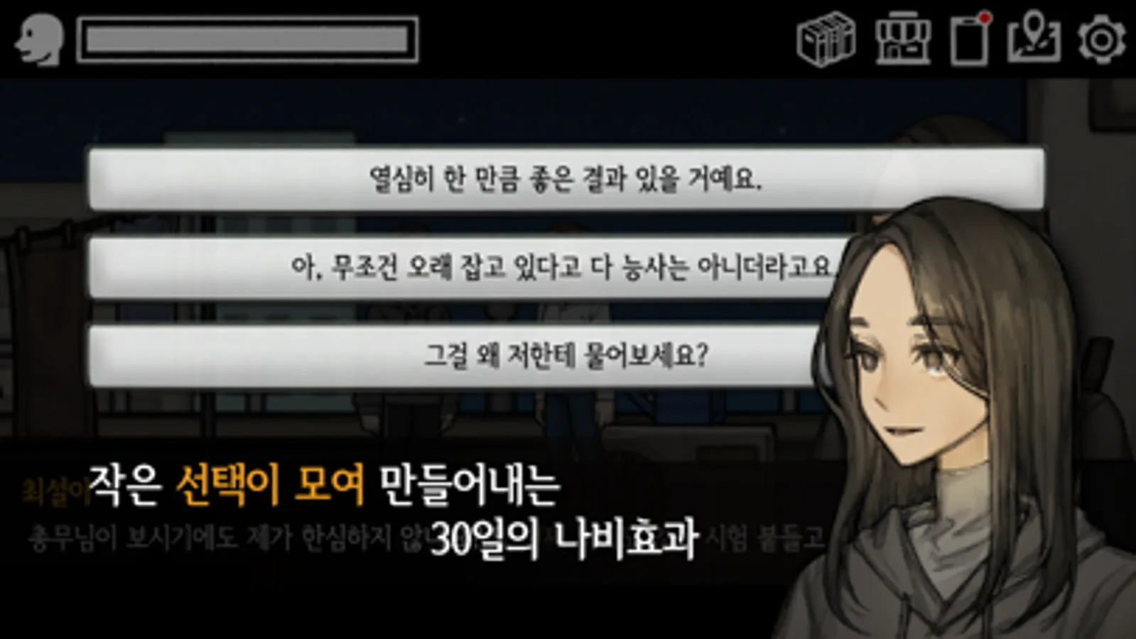 게임 「30일」은 자살 예방을 소재로 한 멀티 엔딩 스토리 어드벤처 게임입니다.
