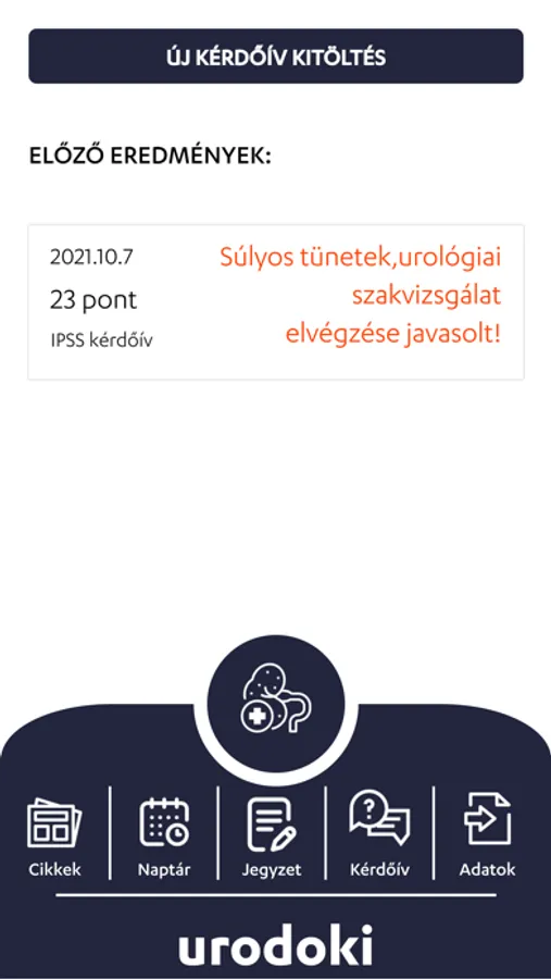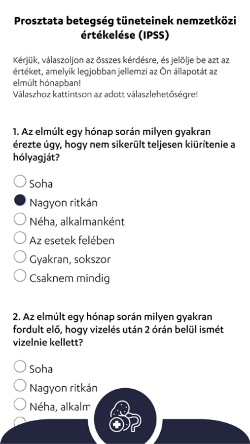 Az applikáció a fentieken túl arra is lehetőséget kínál, hogy a kezeléssel kapcsolatos legfontosabb információkat feljegyezze, és ezáltal segítse az orvos és beteg közti találkozókat. Továbbá az alkalmazáson keresztül kitölthető a prosztata betegség tüneteinek értékelésére szolgáló nemzetközileg használt ún. IPSS kérdőív is, amellyel néhány egyszerű kérdés segítségével pár perc alatt felmérheti az alsó húgyúti tünetek súlyosságát. (Bővebb információ: https://urodoki.hu/prosztata/63-prosztata-ipss)