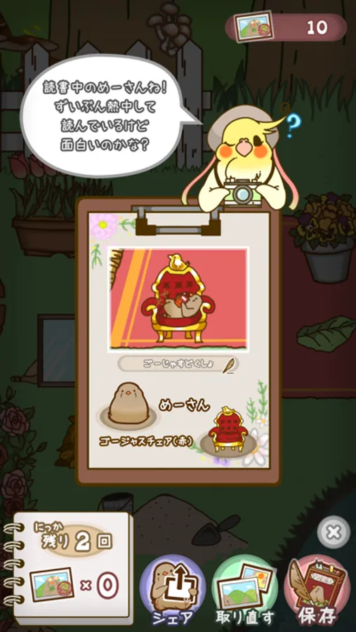 ゲーム中では「ひろば」にグッズを配置することで、集まってきた鳥さんの写真を撮ることができるぞ!