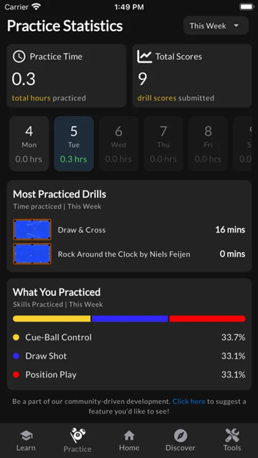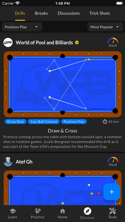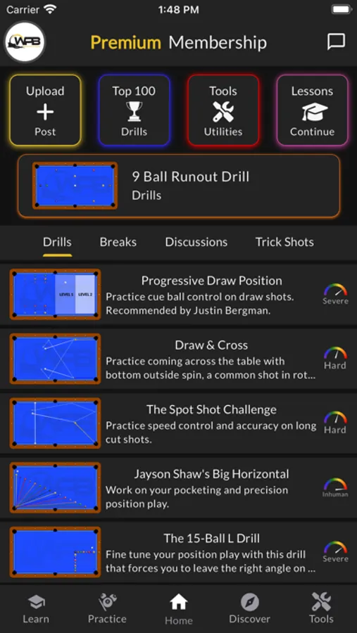 Access over 100 drills that are designed to help you improve specific skills. No need to mindlessly throw balls on the table and shoot them in no particular order. Drills give you a specific layout, with directions, but it won't feel like you are practicing alone as you compete to get onto the top of the weekly leaderboard.