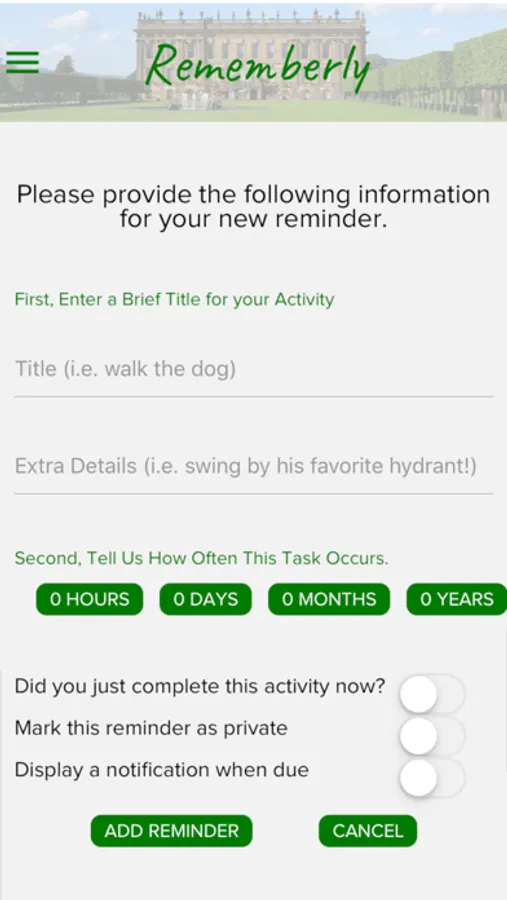 Rememberly is a recurring task tracker app. It is NOT a calendar app. It has one job - to help you remember the little things that need to happen every now and again before they sneak up on you!