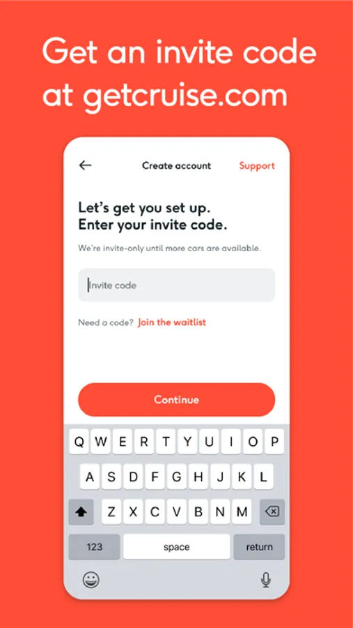 First, join the waitlist at www.getcruise.com. We’ll send an invite code when a spot opens up. Then, enter your code in the app to sign up. Already a member? Sign in with your email and phone number.