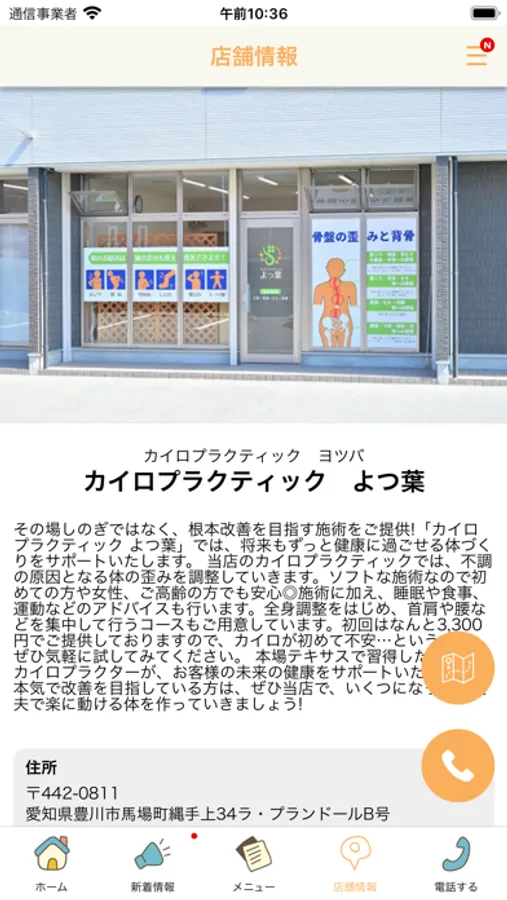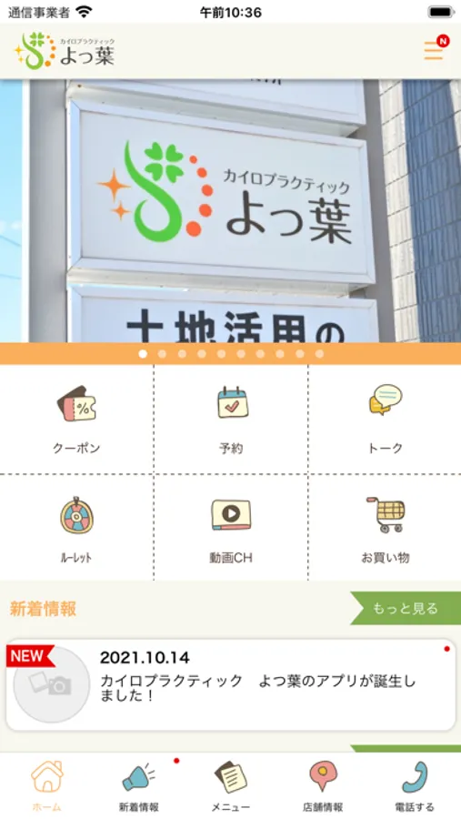 カイロプラクティック よつ葉の公式アプリが登場。アプリを通して『カイロプラクティック よつ葉』の新着情報やお得な情報をリアルタイムで受け取ることができます。また、いつでもお手元のスマートフォンから、メニューやご希望のお時間帯のチェック・ご予約などが可能です。アプリをインストールしていただくことにより『カイロプラクティック よつ葉』を、より便利に身近にご利用していただけます。