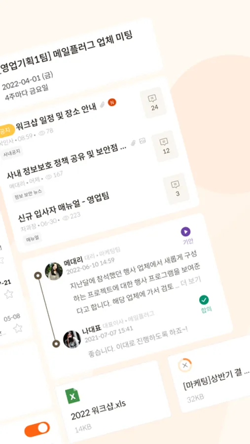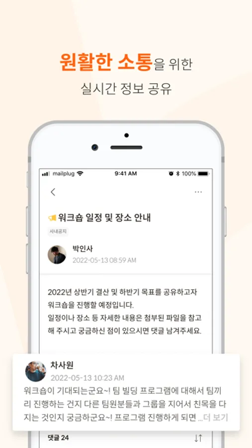 게시판을 통해 업무를 공유하거나 댓글로 소통해 보세요.