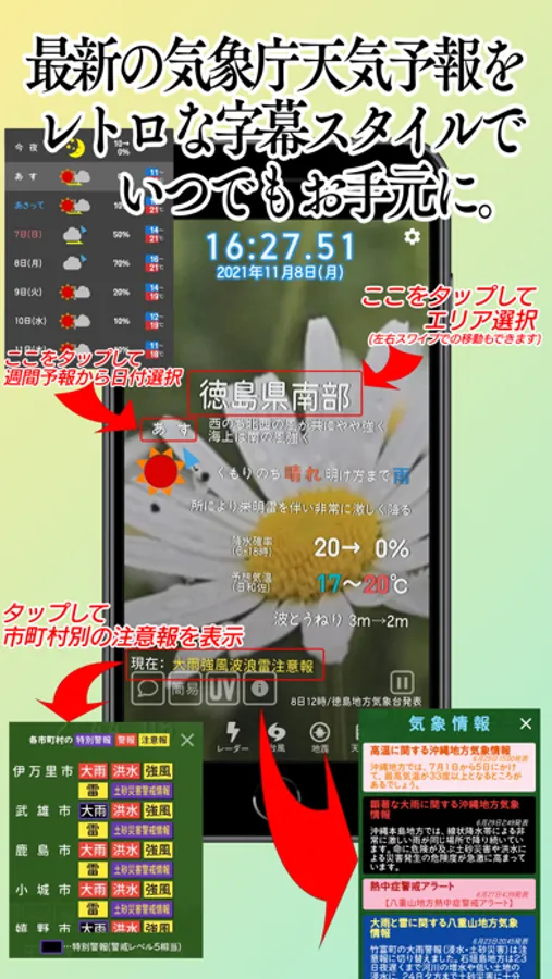 ・「〇〇気象台発表」をタップで気象庁公式サイトを表示しアプリが正しく表示しているか確認できます
