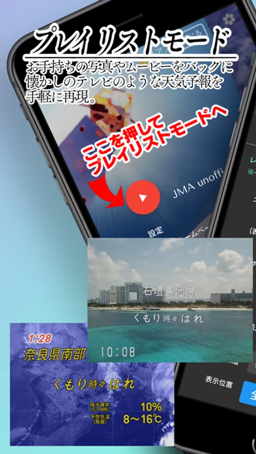 ・ドロワーの再生ボタンで指定した複数の地域をテレビの天気予報のように連続表示するプレイリスト自動再生機能(おすすめ)