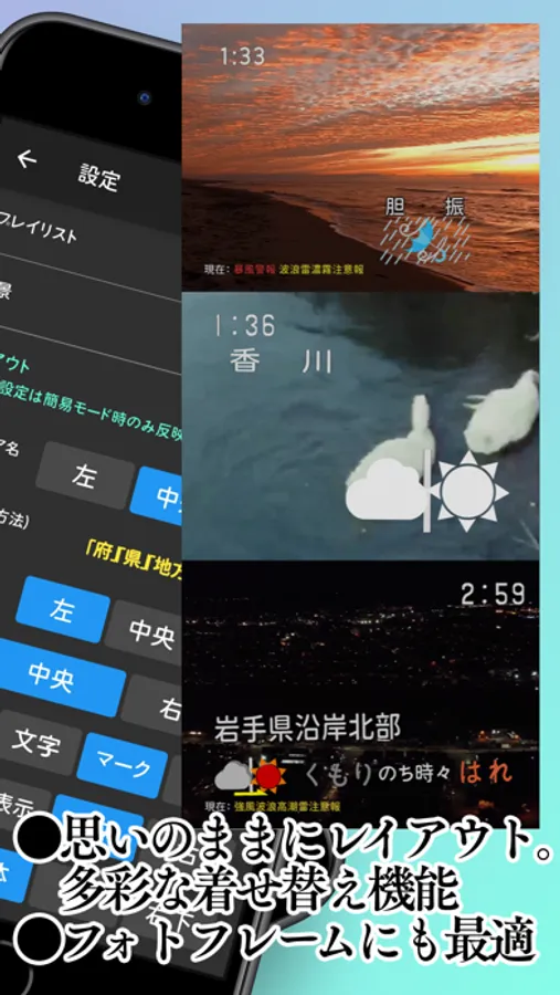・ご自身で撮影した写真や動画を背景にできます。例えばご自身で作曲した楽曲の演奏動画をバックに「歌う天気予報」風にも…