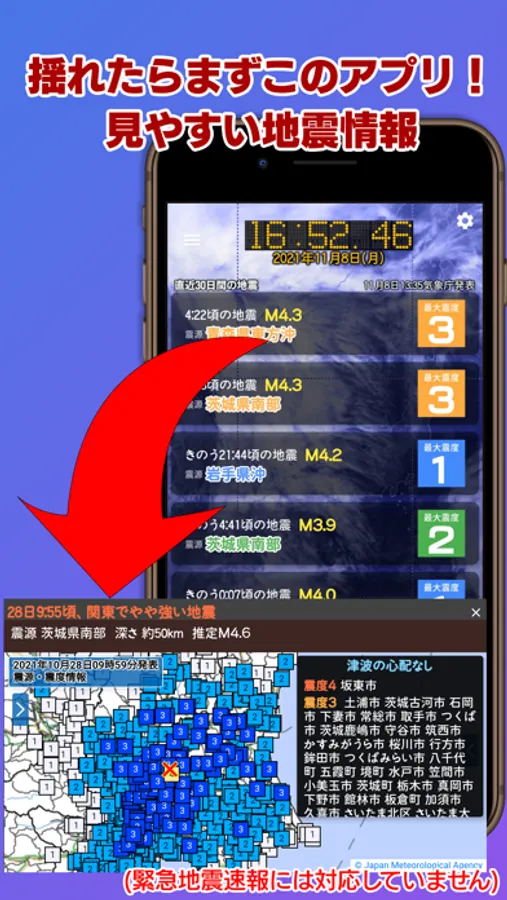 ・さらに各地の震度情報を長押しで震度分布地図を表示できます(気象庁公式サイトをそのまま表示)
