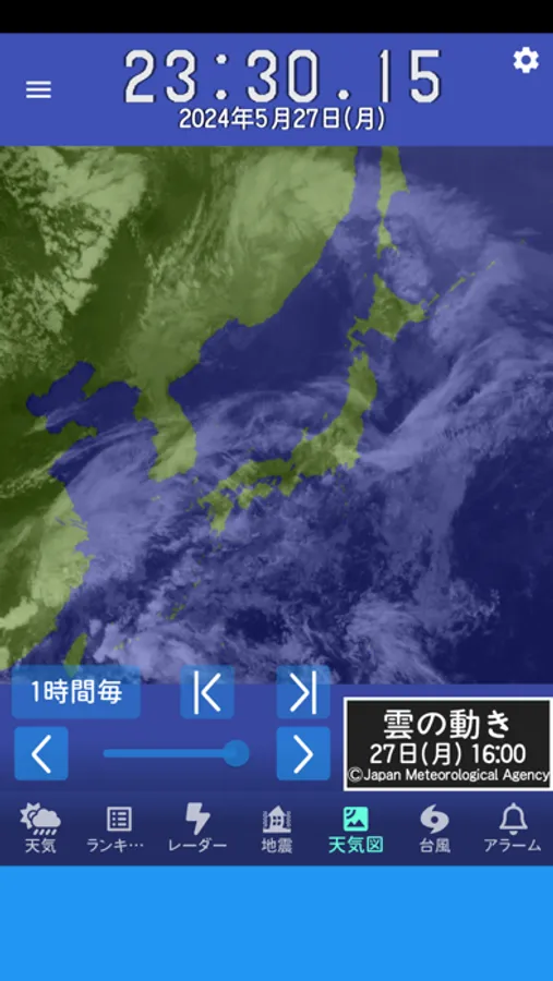 全国の大まかな雨雲と落雷位置、15時間先までの雨雲予測が見られます