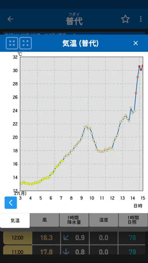 ・[詳細]ボタンで「所により~」のような詳しい予報と時系列天気予報が見られます