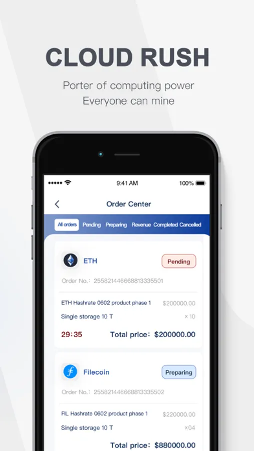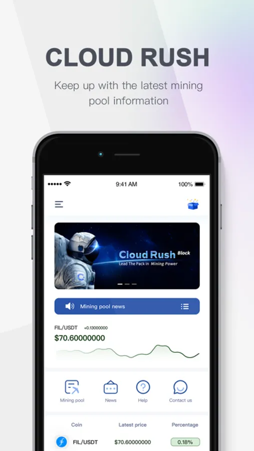 The Cloud Rush App puts all of your mining reports on an easy-to-use phone App. The Cloud Rush App enables you to check your token output, securely store tokens in your wallet, check on the market FIL price, and have 24/7 access to the Cloud Rush customer service center. The Cloud Rush App, from the Filecoin/IPFS decentralized data storage experts (who is now storing NFTs), provides you with the data you need to see how your mining business is doing. Cloud Rush and their Filecoin platform outperforms BTC, ETH, Coinbase, Binance, Bitman, and others in the digital currency industry.