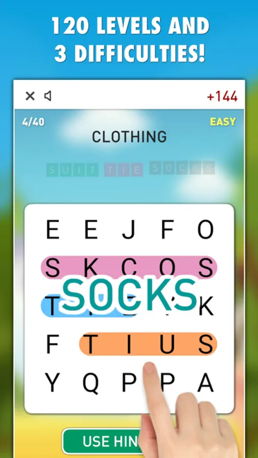 There will be shown hidden words on the screen and a board of letters. Try to find all the words as fast as possible. Just move your finger over the letters horizontally, vertically or diagonally to select the words. When you are stuck, you can use a hint that highlights the first letter of the hidden word.
