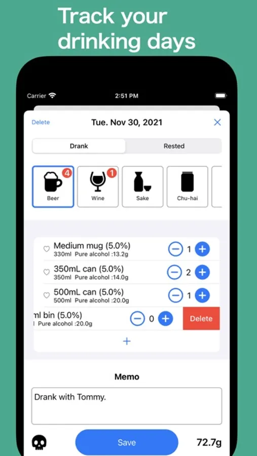 - The number of rest days and over drinking days can be totaled monthly.