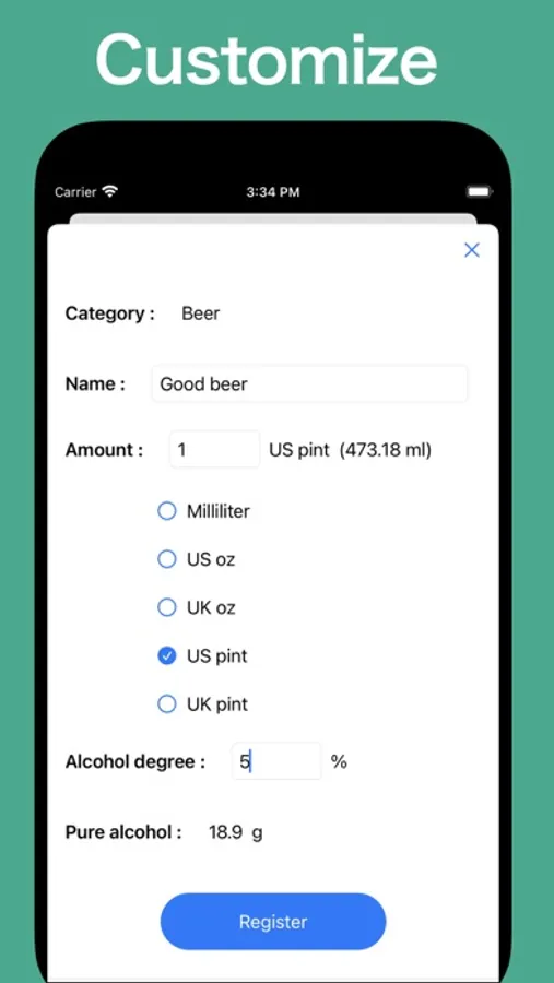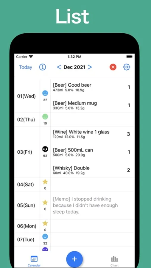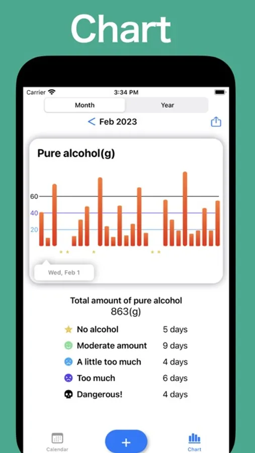 When you enter the alcohol you drank, you can calculate the amount of pure alcohol and display it on the calendar and the chart.
