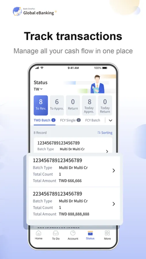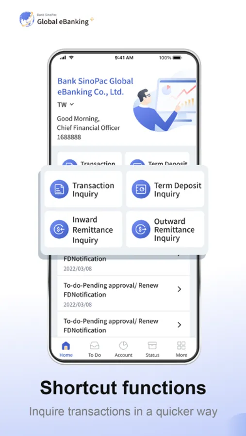 Global eBanking+ provides corporate customers with mobile financial services, helping customers grasp account information easily and manage cash flow efficiently.