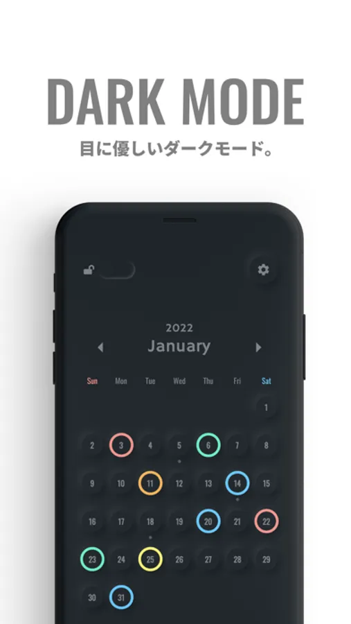 -- One tap on a date button will change the color of its outline. Further tapping will change the color in the order specified on the settings view by one color each tap. If your work has a shift schedule and it has day/swing/night shifts, you can make the shift management easier by marking your day-shift dates with the red color, swing with the blue color and night with the green color. You can differentiate the coloring patterns month to month, to have your varying shift patterns easily reflected on your scheduler. Also, with an additional Notes feature, you can write multi-line texts for each date.