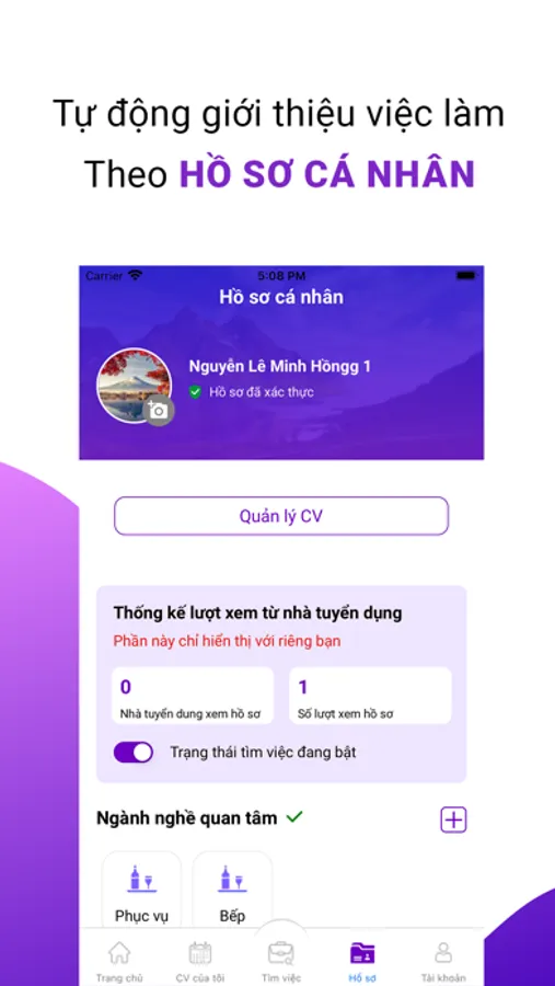 + Hệ thống tự động đề xuất công việc phù hợp với thông tin bạn nhập vào