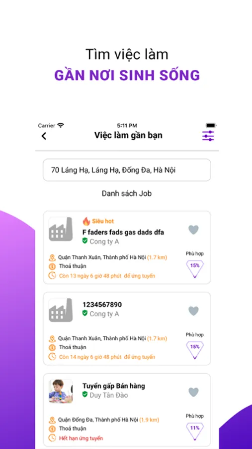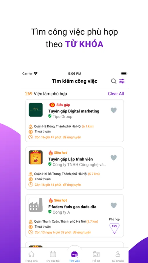 + Tính năng tìm việc làm nâng cao giúp bạn tìm việc khớp với các yêu cầu cá nhân: thời gian, địa điểm, mức lương, công việc, vị trí tuyển dụng, ...