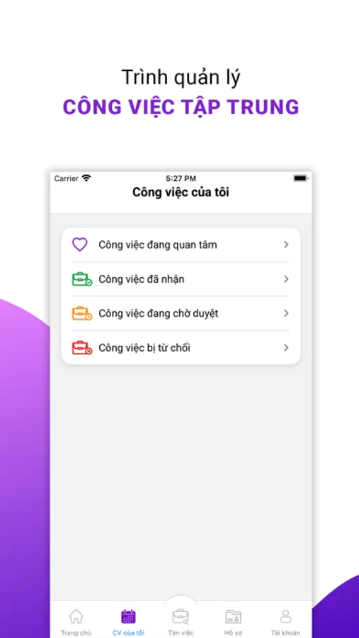 + Phân nhóm các công việc đã nhận, đang quan tâm, và công việc chờ duyệt