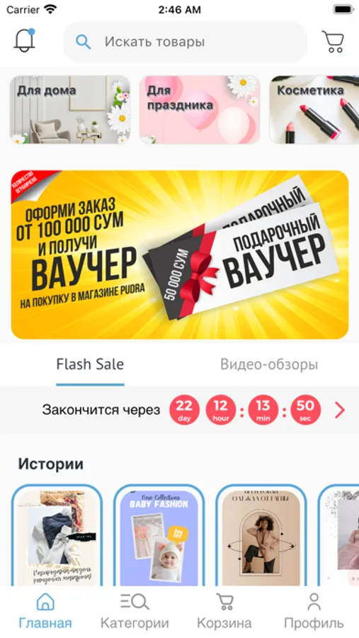 Каждому покупателю при первой покупке даётся купон на 5% скидку на заказ до 300 000 сум, а при заказе от 300 000 сум - Бесплатная доставка.