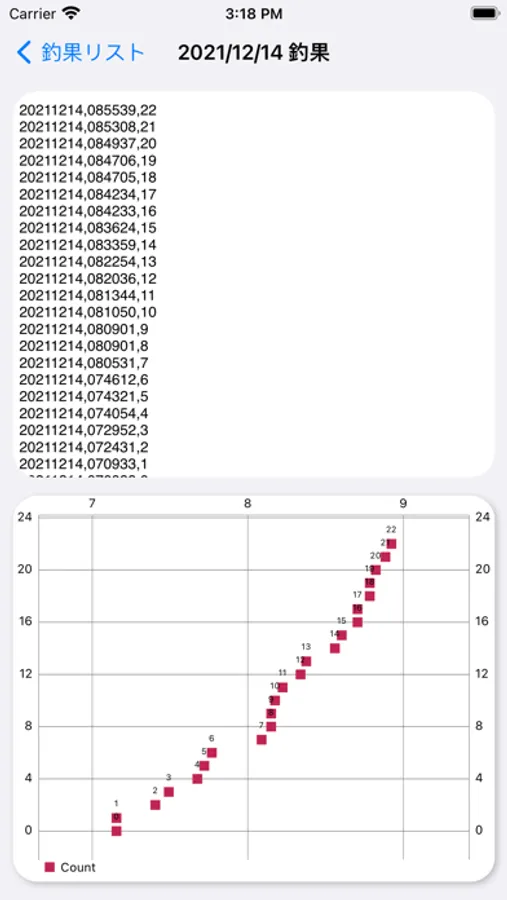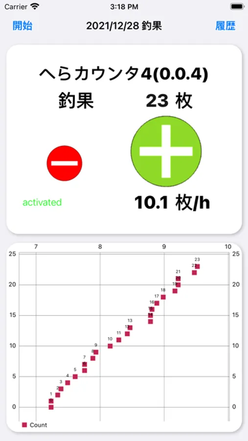 ヘラぶな釣りでの枚数のカウントと時間当たりの枚数と時系列で釣果のグラフを表示するアプリです。