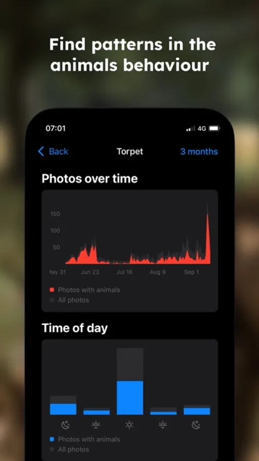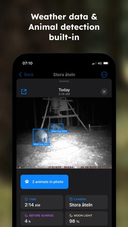 - Weather & astronomical data is collected for each photo to help you find patterns in the animals behaviour.