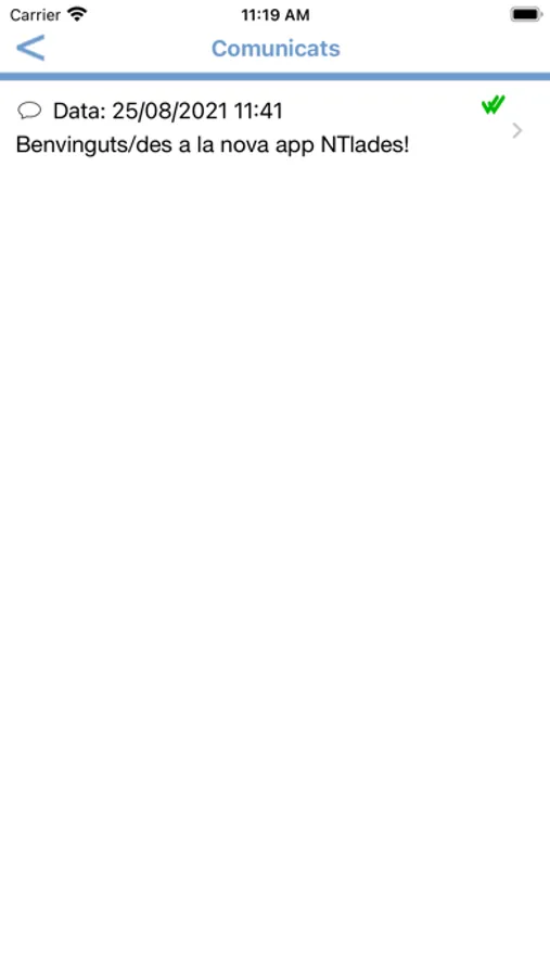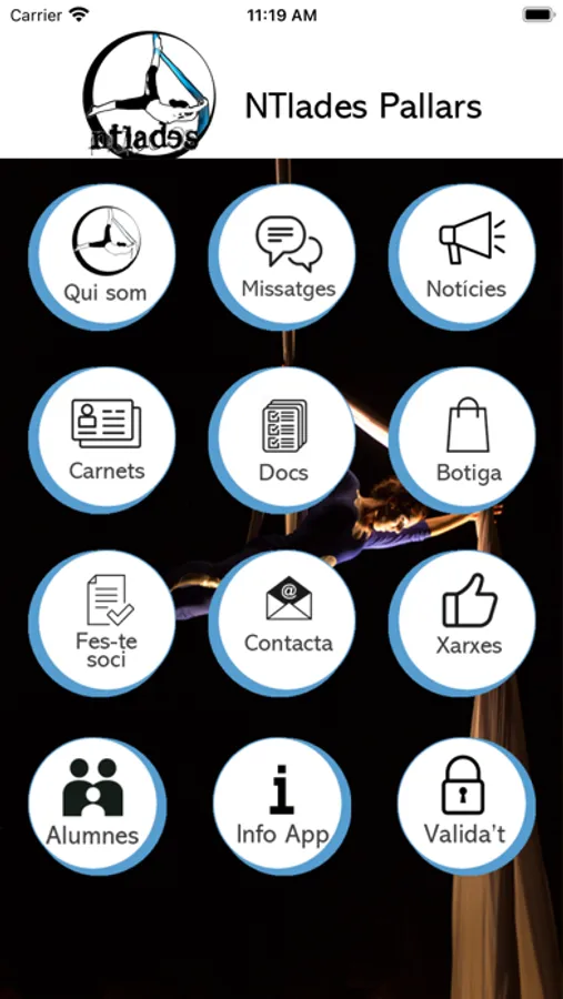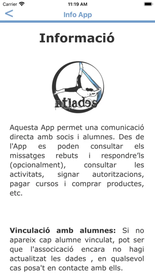 App de NTlades. L'aplicació permet una comunicació directa entre el centre i els usuaris. El menú consta amb diverses opcions: qui som, comunicats, notícies, carnets, documents, botiga, fes-te soci, contacta, xarxes. A la barra inferior hi ha la secció Alumnes, Info App i Valida't.