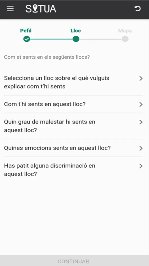 SITUA és una aplicació que permet als seus usuaris registrar qualsevol tipus de malestar i/o discriminació que pugui sentir en algun espai quotidià (espai públic, laboral, domèstic, formatiu, etc.) tenint en compte la dimensió emocional i la localització espacial. Les dades registrades seran utilitzades per a fer un anàlisi estadístic sobre incidents relatius a situacions discriminatòries, d’agressions sexistes, racistes, homofòbiques. Es tracta, doncs, d’un projecte d’investigació sense ànim de lucre d’interès general en l’àmbit de la universitat pública.