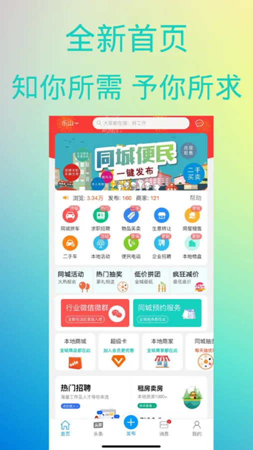 房屋租售,二手买卖,招聘求职,商务服务,酒店用品,相亲交友,本地商家,餐饮娱乐,本地资讯,同城抢购,同城商城,覆盖全国大中城市,汇集大量个人和商家信息。