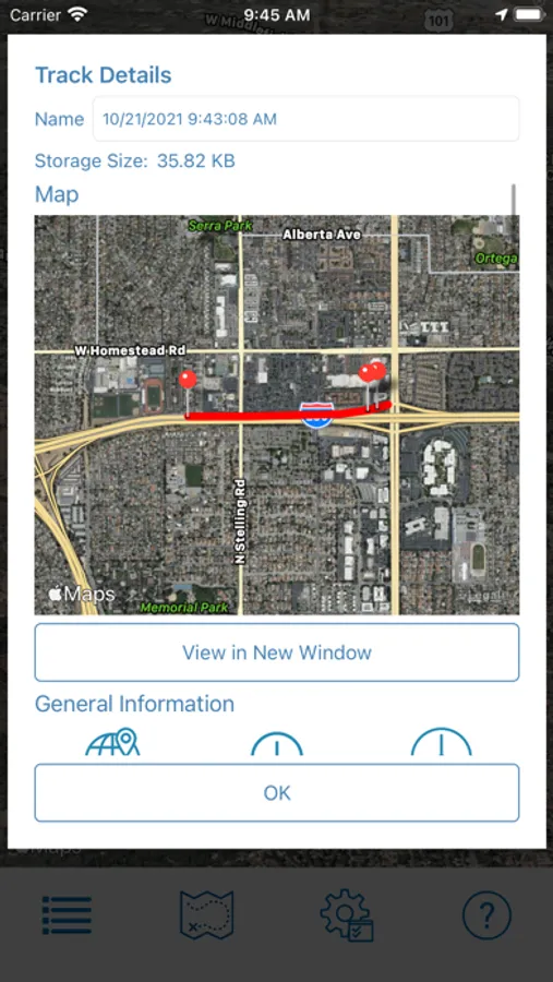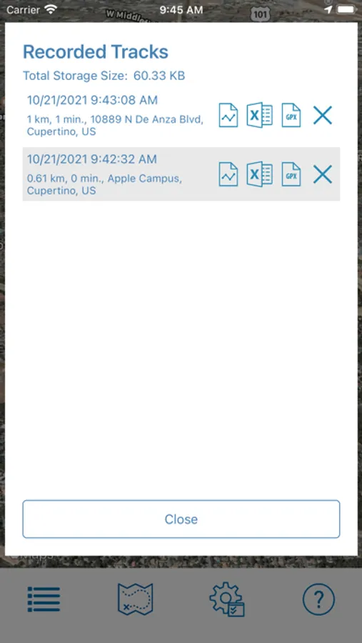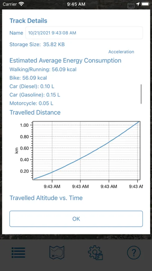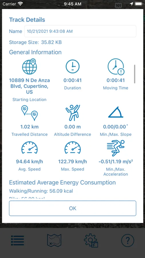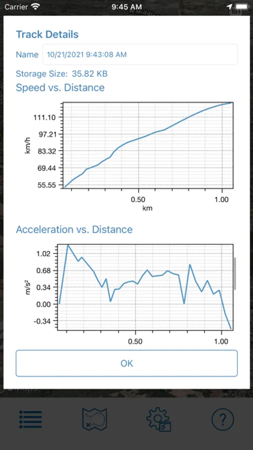 - View recorded track details: Distance Travelled, Moving duration, Avg/Max Speeds, Min/Max Acceleration, Min/Max Slope and more