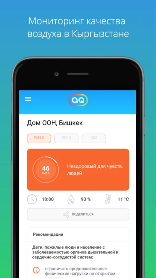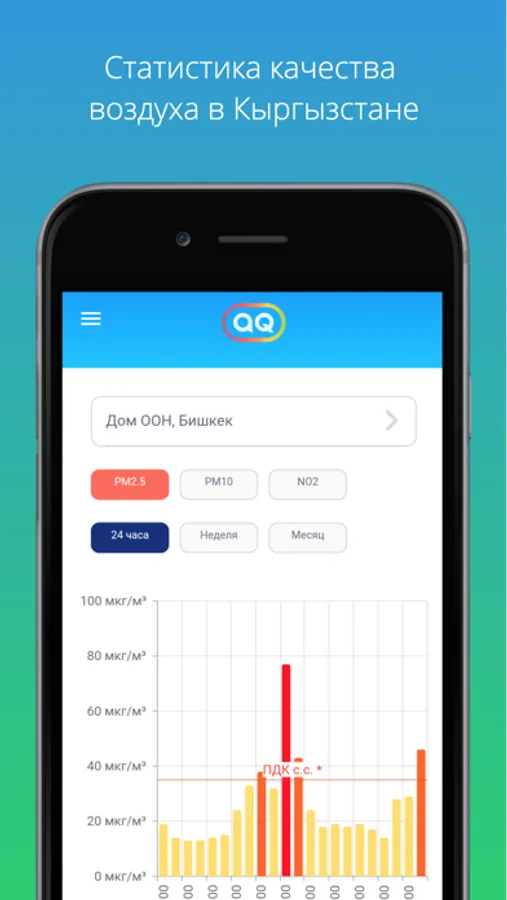 Пока данные доступны по городам Бишкек и Ош, но по мере подключения новых объектов мониторинга, информация в приложении будет обновляться.