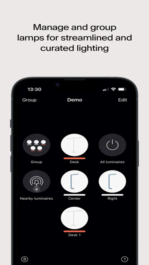 The Grau app lets you see all your Grau lamps in one view, build lamp groups, and program both individual and group settings. With a tap or slide of your finger, you can switch lamps on and off, adjust brightness, and tune color temperature. Create and name groups according to room or situation, and coordinate dimming, color, and temperature settings.